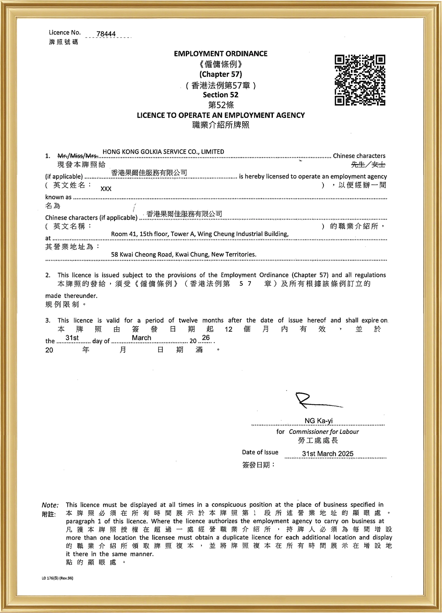 香港果尔佳服务有限公司作为香港劳工处正式授权的职业介绍所牌照持牌人(牌照号:78444),专注于为香港雇主提供一站式外劳解决方案,同时为内地求职者搭建专业、安全的赴港就业通道。依托香港与内地双市场资源,公司构建了覆盖招聘面试、签证办理、职业发展的全链条服务体系,助力香港企业解决用工难题,推动内地优质人才高效流动。