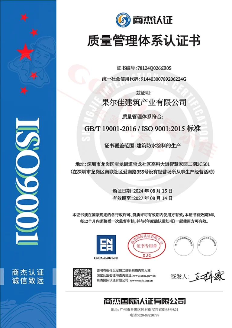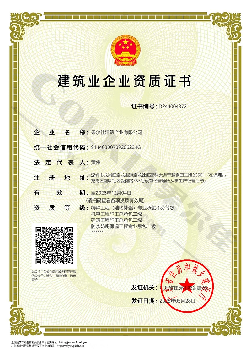 Golkia has the first-class qualification for professional contracting of waterproofing, anti-corrosion and thermal insulation projects, as well as qualifications for professional contracting of decoration and renovation, curtain walls, mechanical and electrical engineering, environmental protection, labor, formwork and scaffolding, and special projects.